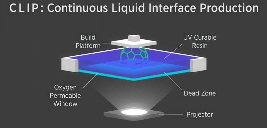 Unlike conventional layer-by-layer 3D printing, CLIP utilizes a continuous process that draws parts from a pool of liquid resin. Here's a simplified explanation: